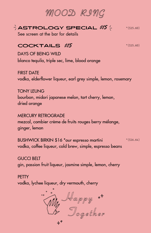 Welcome to Mood Ring, a captivating destination nestled in the heart of Brooklyn at 1260 Myrtle Ave. This vibrant bar and lounge artfully blends astrology with mixology, creating an immersive experience for guests. The menu features imaginative cocktails like DAYS OF BEING WILD and MERCURY RETROGRADE, each thoughtfully crafted to resonate with the celestial vibes of the cosmos, all priced at $15. For wine lovers, select house options start at $11.